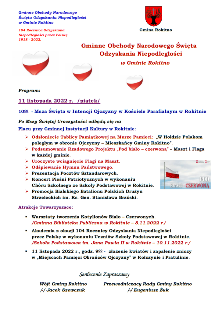 - Odsłonięcie Tablicy Pamiątkowej na Murze Pamięci: „W Hołdzie Polakom poległym w obronie Ojczyzny – Mieszkańcy Gminy Rokitno”.